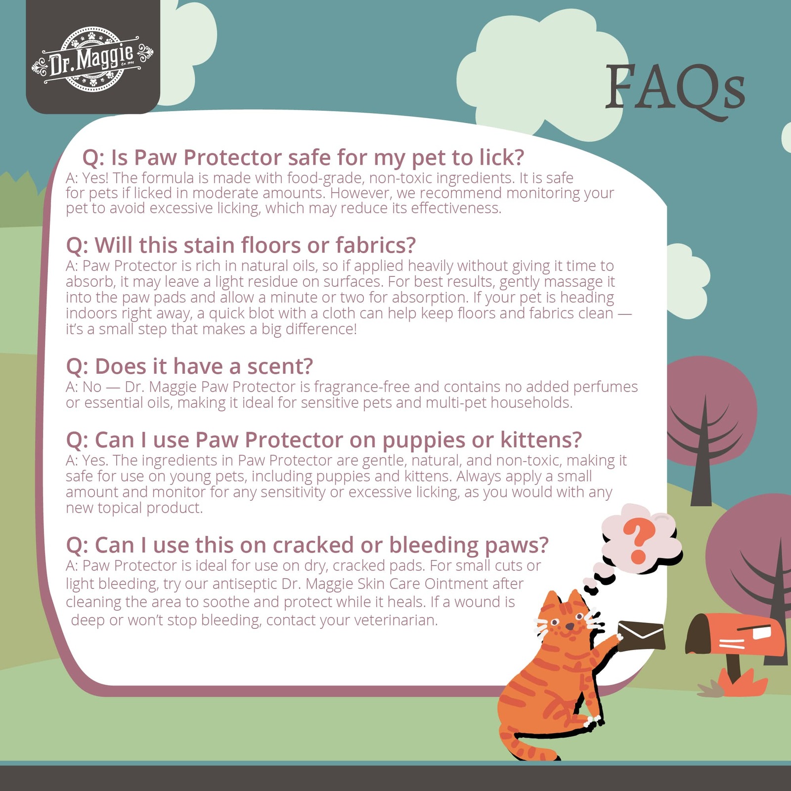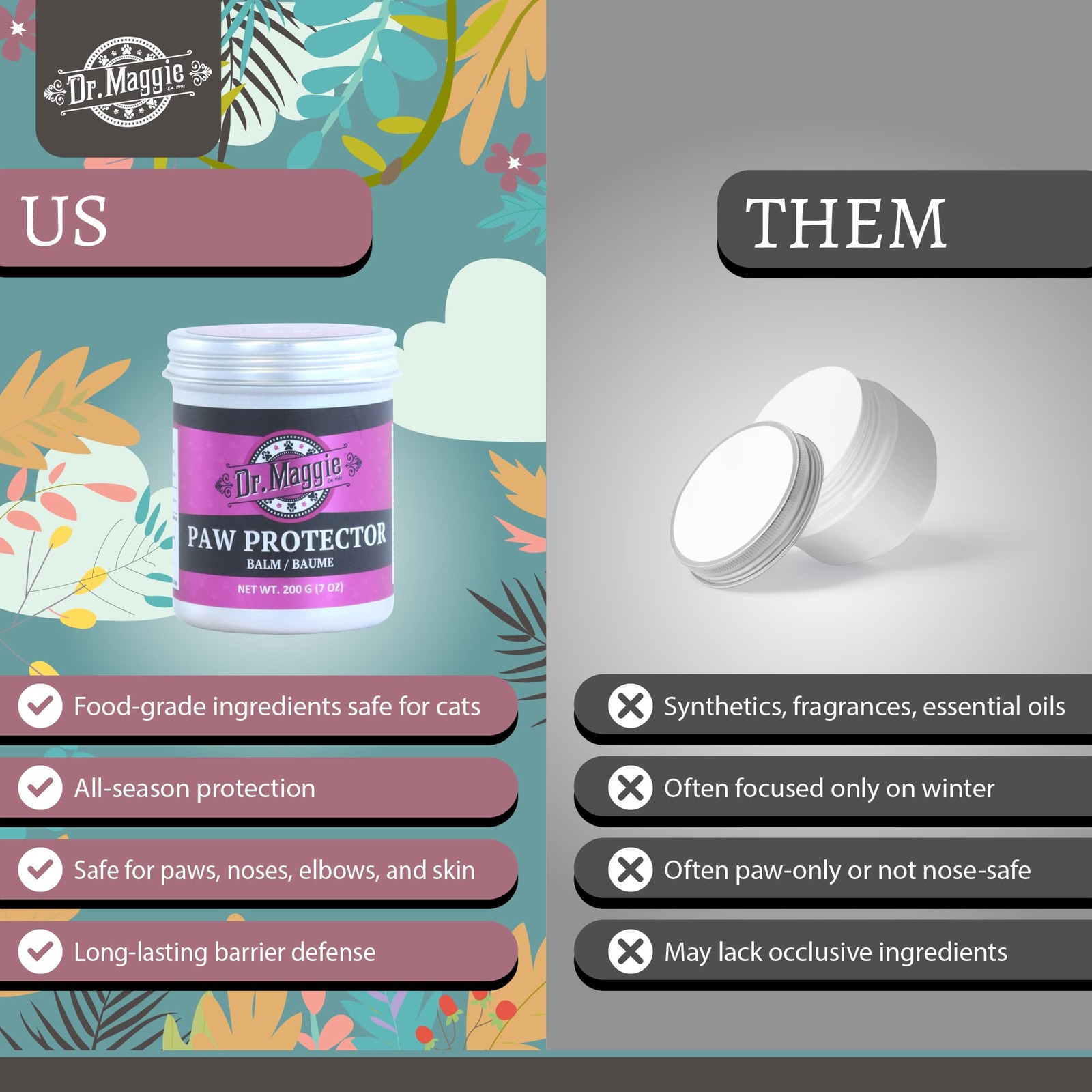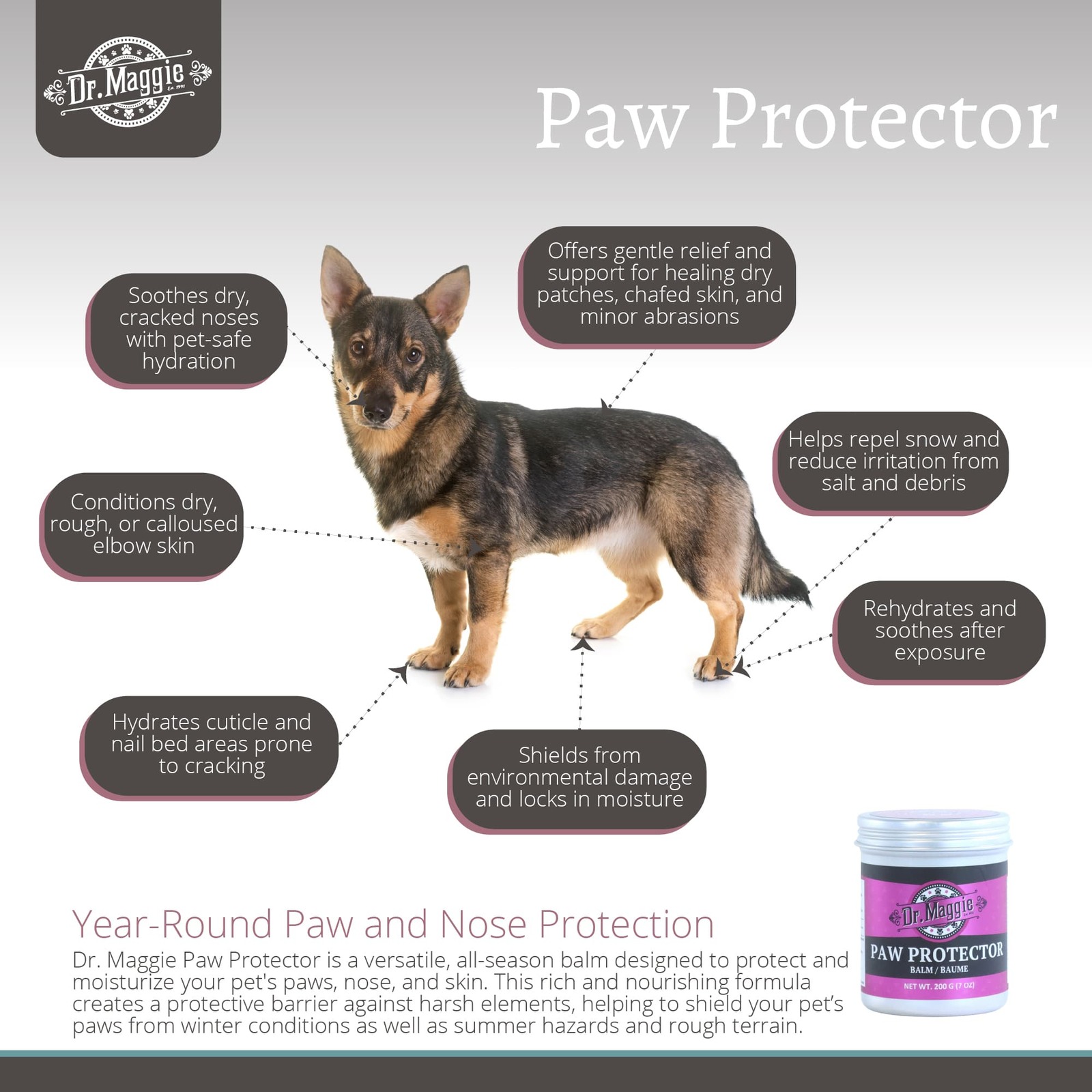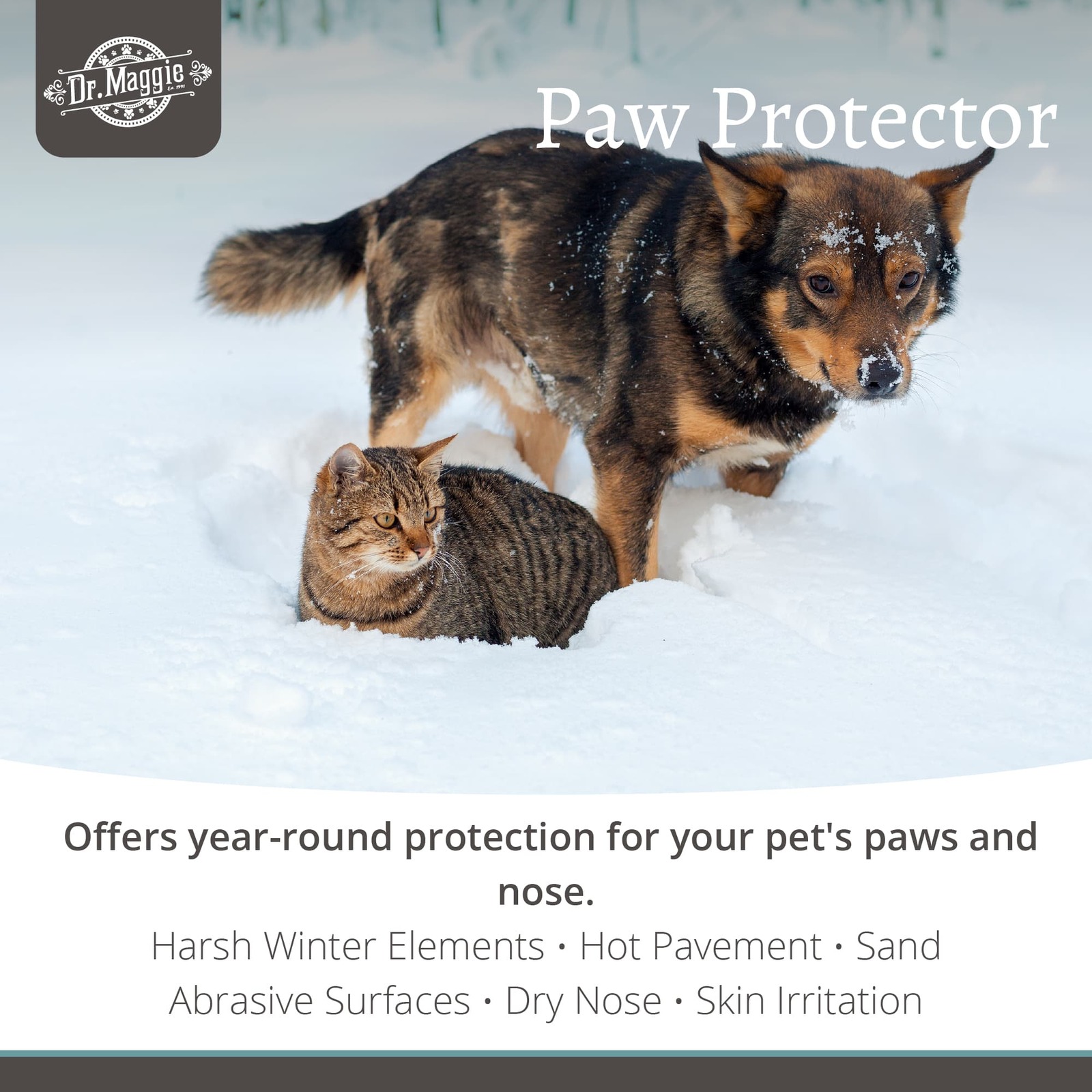 Generously apply balm to evenly coat all paw pads. May be used as a daily moisturizer or as desired prior to heading out for a walk, hike, run, or any other outdoor adventures where your pet may be exposed to harsh elements or abrasive surfaces. Dr. Maggie Paw Protector is not a substitute for professional veterinary care. If your pet has underlying joint conditions or if you have concerns about their paw health, it is always advisable to consult with a veterinarian.