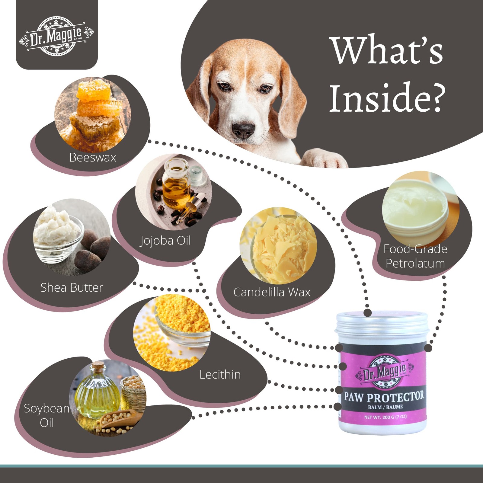 Dr. Maggie’s Paw Protector is perfect for your four-legged friend’s paws, nose, claws, or anywhere that needs a little bit of extra moisture. Candelilla Wax, Jojoba Oil, Shea Butter, Beeswax, Soybean Oil, Lecithin, and Calendula are all-natural and gentle ingredients which are perfect if your furry friend has sensitive skin.